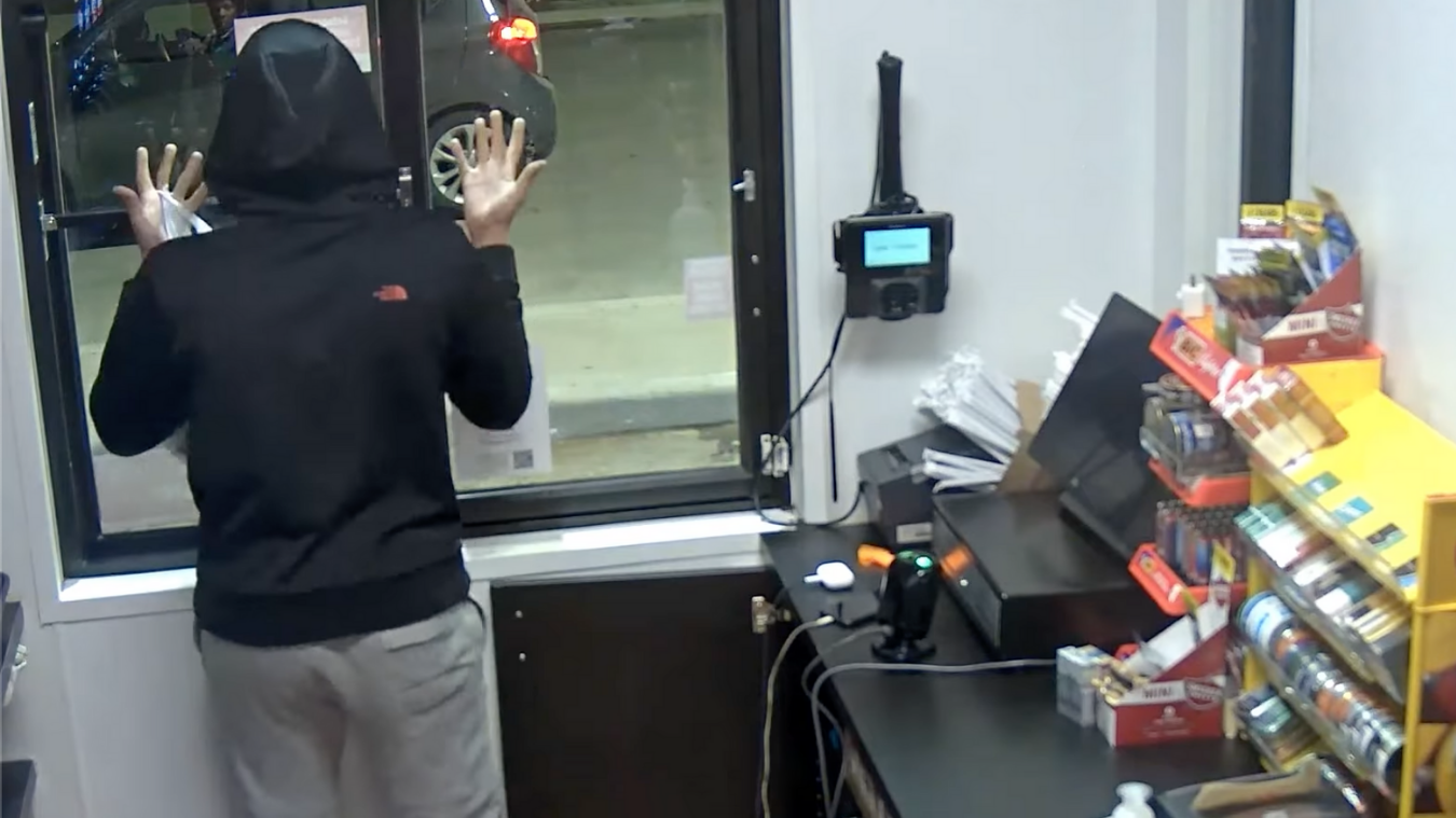 The Oklahoma City Police Department shared the surveillance video from the store on social media Tuesday of a man trying to flee the scene after taking items from behind the cash register at the OnCue. The video shows the suspect placing packs of cigarettes and other items from behind the counter into a plastic bag. The suspect then tries to escape through the drive-thru window, but can't figure out how to get it open. He frustratedly fumbles around for about a minute before a woman in the getaway car approached the window. It's apparent she gave him some good advice, because he was able to open the window, jump out and escape.