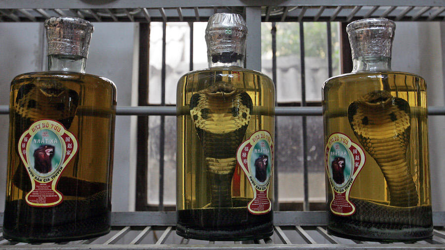 Snakes are commonly used in medicinal wine as they're believed to have medicinal qualities and snake wine is advertised as an aid for varying medical issues such as hair loss, vision issues and erectile dysfunction, among others.