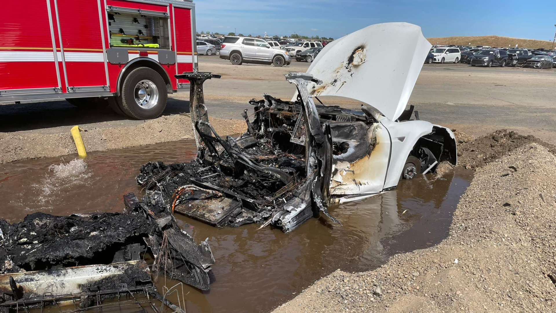 "The vehicle was fully involved with fire on arrival, and took a significant amount of time, water, and thinking outside the box to extinguish. Crews knocked the fire down, but the car kept re-igniting and off-gassing in the battery compartment. Working with the on-site wrecking yard personnel, the Tesla was moved on its side to gain access to the battery compartment underneath. Even with direct penetration, the vehicle would still re-ignite due to the residual heat. Crews and on-site personnel then created a small pit, placed the car inside it, and filled the pit with water effectively submerging the battery compartment. The pit ultimately reduced the total amount of water needed, estimated at 4500 gallons, and limited the runoff of contaminated water," the post read.