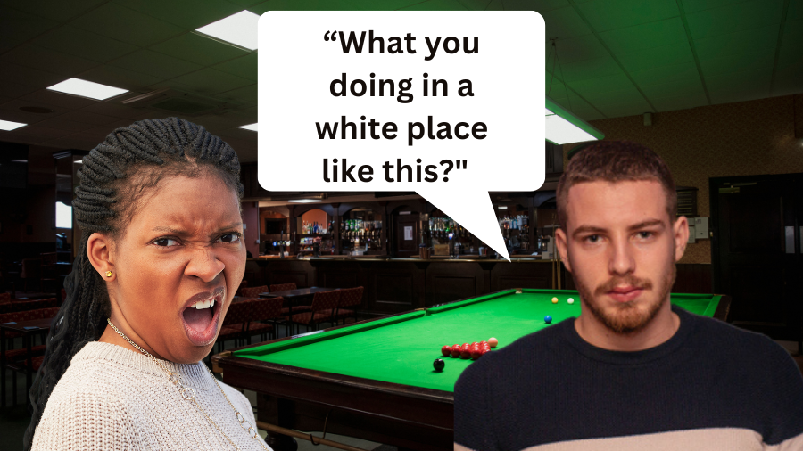 “I am in a white place like this because I am here to play pool," she fires back. "This is the only place where there is a pool table. So, that’s what I am doing at a white place.”