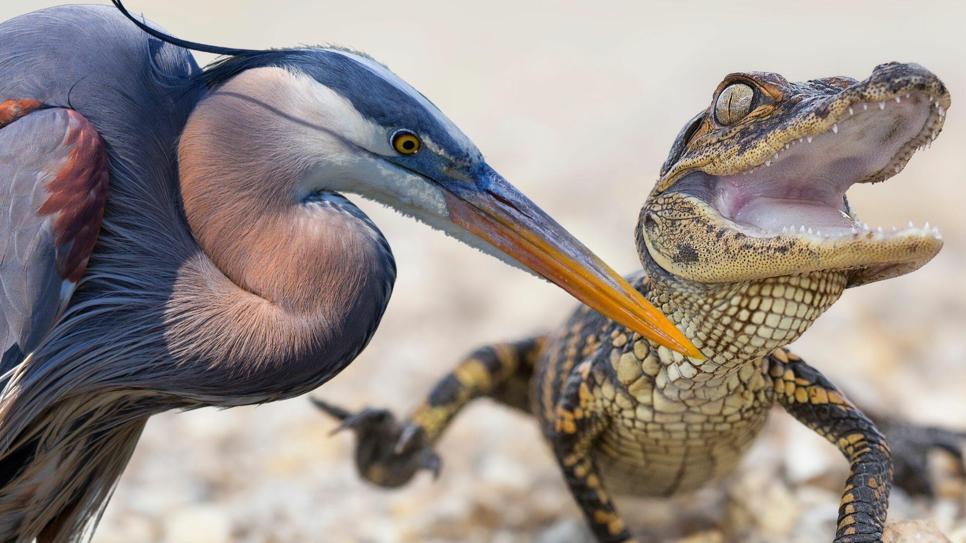 A Florida wildlife photographer captured a stunning sight on camera: a great blue heron snatching a baby alligator from its angry mother.