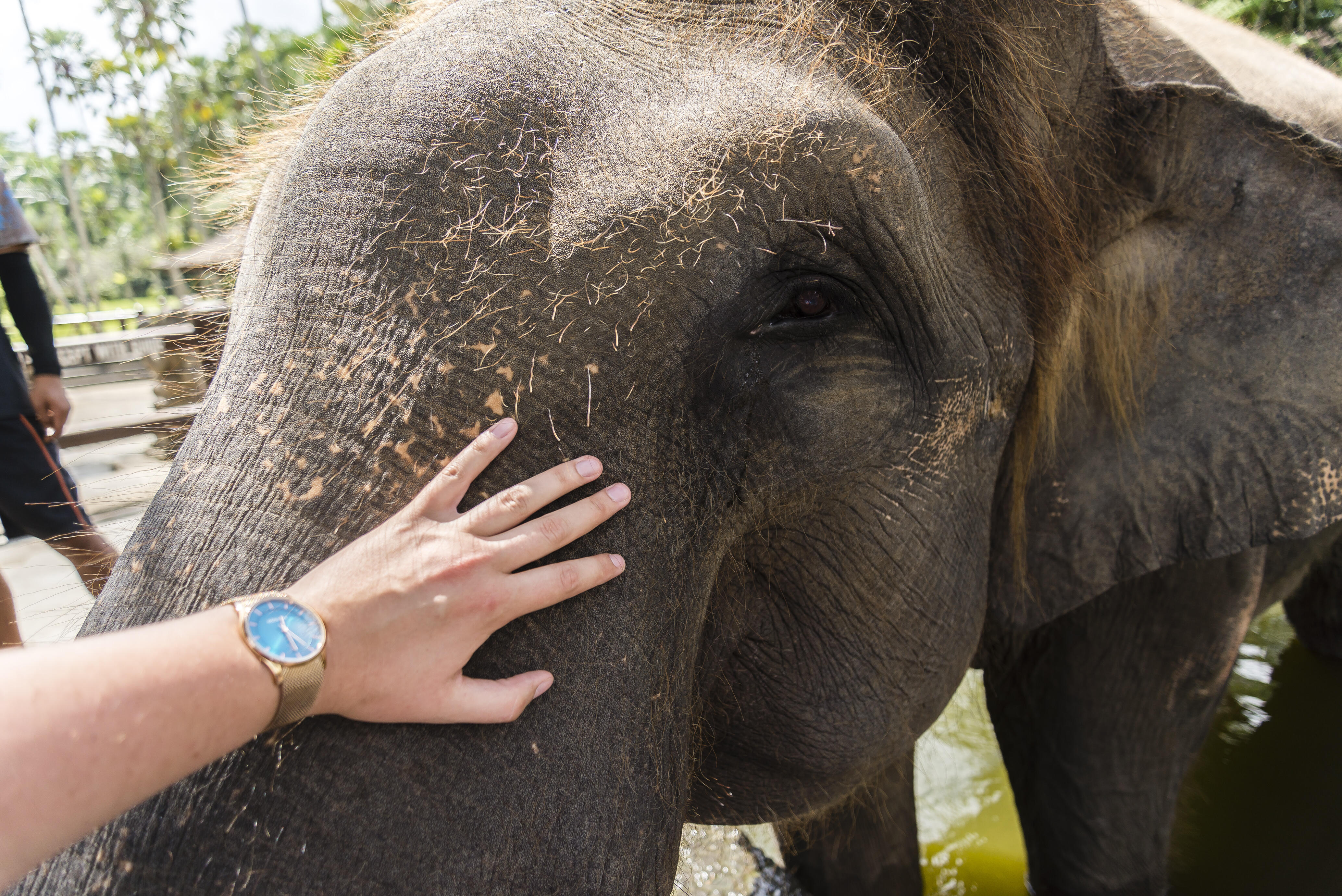 After spending the day swimming and riding the elephant, she went to pose with it for a photo. As the trainer was helping set up the shot, the elephant bit her arm.