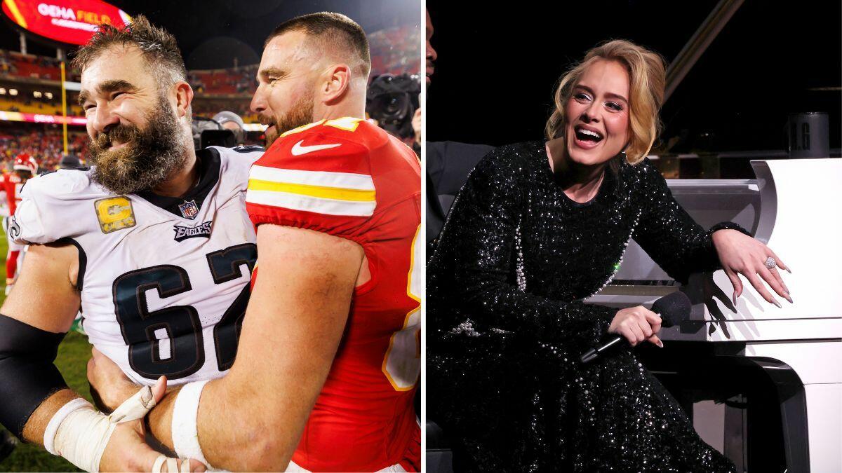 A video shared by the official X account for 'New Heights,' the iHeartRadio Podcast of the Year nominated show Jason hosts alongside his brother, Kansas City Chiefs tight end Travis Kelce, shows the singer on-stage during her residency at The Colosseum Theater at Caesars Palace on Friday (February 9). Adele, sitting behind a piano, is seen asking the crowd whether they're fans of the Chiefs or the San Francisco 49ers ahead of Sunday's (February 11) Super Bowl LVIII matchup at Allegiant Stadium, at which point Kelce is heard yelling, "EAGLES," from the crowd.
