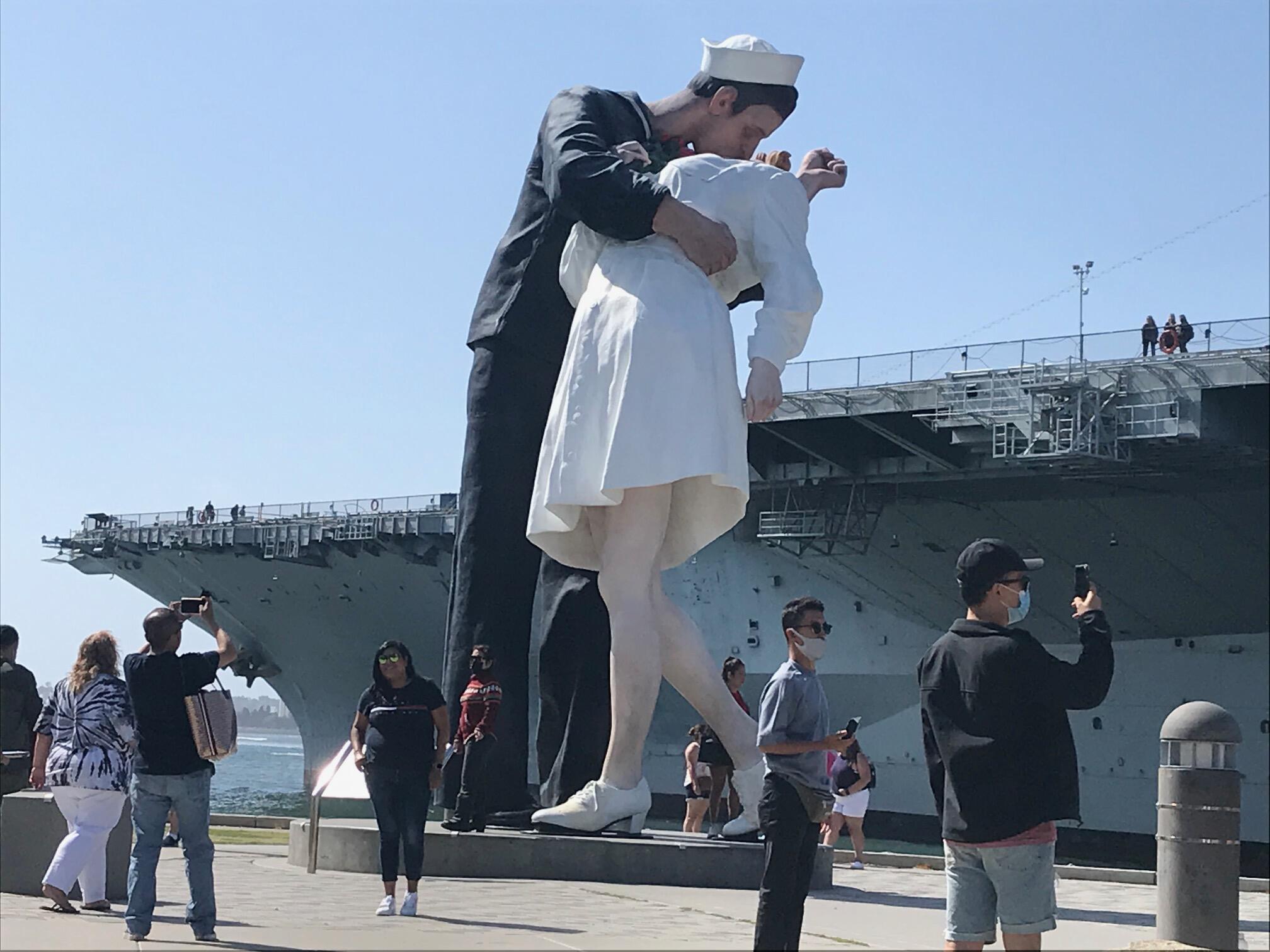 (Photo C E. Albert) San Diego’s eye-catching statue replicating the iconic World War II-era photograph of a lip-locked sailor and a nurse is something everyone knows. Known as “Embracing Peace” located next to the USS Midway.