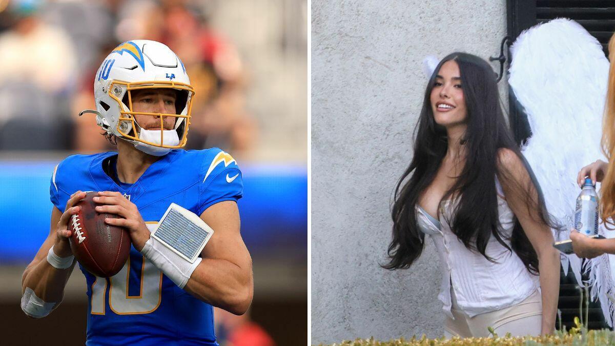 Los Angeles Chargers quarterback Justin Herbert was seen sharing a kiss with pop star girlfriend Madison Beer prior to his team's game against the Washington Commanders at SoFi Stadium on Sunday (October 5).