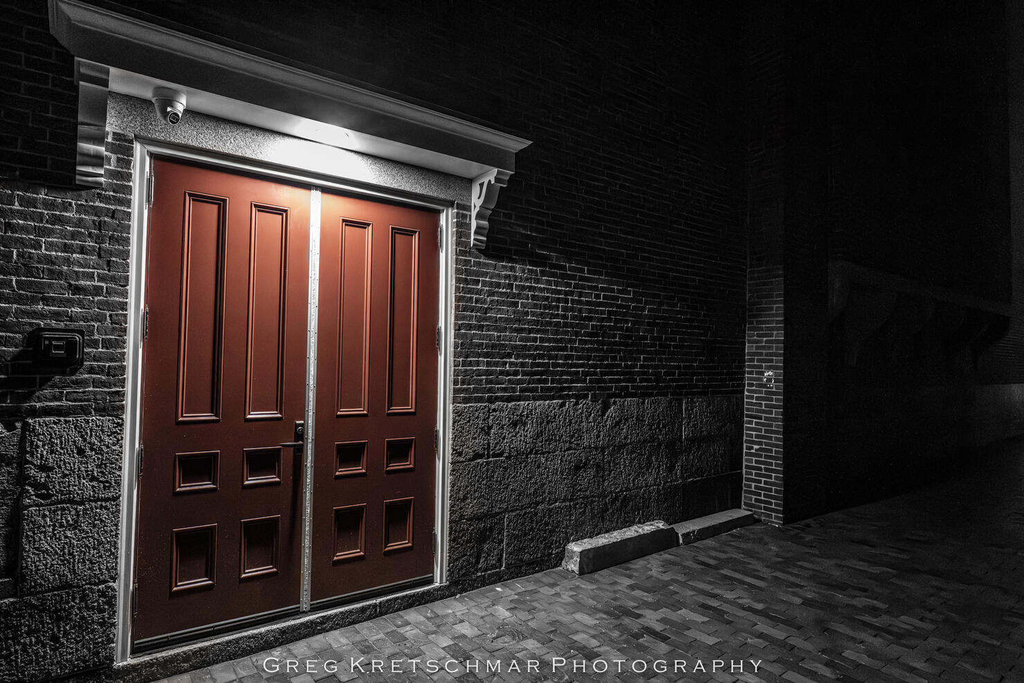 Taking pictures in alleyways at 430am - this is the back door of the church pictured above. I thought it looked cool and i gave it the black and white treatment but left the red doors alone-