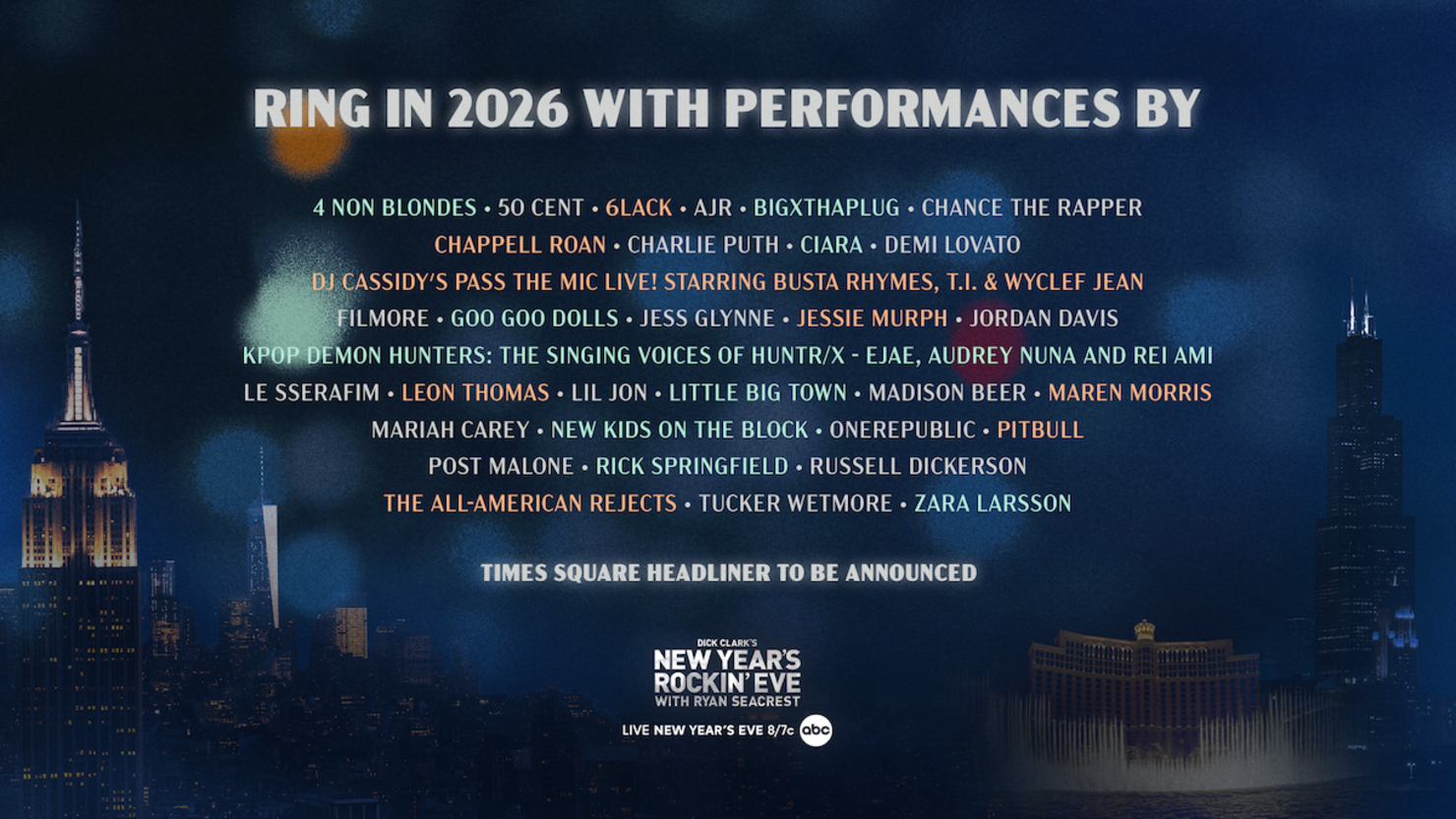The party kicks off in New York and continues through cities including Las Vegas, Chicago, Puerto Rico and beyond, and will feature performances from 4 Non Blondes, 50 Cent, 6lack, AJR, BigXthaPlug, Chance the Rapper, Charlie Puth, Chappell Roan, Ciara, Demi Lovato, Filmore, Goo Goo Dolls, Jess Glynne, Jessie Murph, Jordan Davis, Leon Thomas, LE SSERAFIM, Lil Jon, Little Big Town, Madison Beer, Maren Morris, Mariah Carey, New Kids on the Block, OneRepublic, Pitbull, Post Malone, Rick Springfield, Russell Dickerson, The All-American Rejects, Tucker Wetmore, and Zara Larsson. The show will also showcase DJ Cassidy's Pass the Mic Live! Starring Busta Rhymes, T.I. & Wyclef Jean, as well as KPop Demon Hunters: The Singing Voices of HUNTR/X - EJAE, Audrey Nuna and REI AMI.
