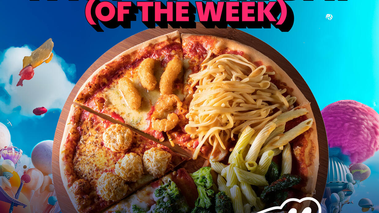 piles up his plate with a week of food origin