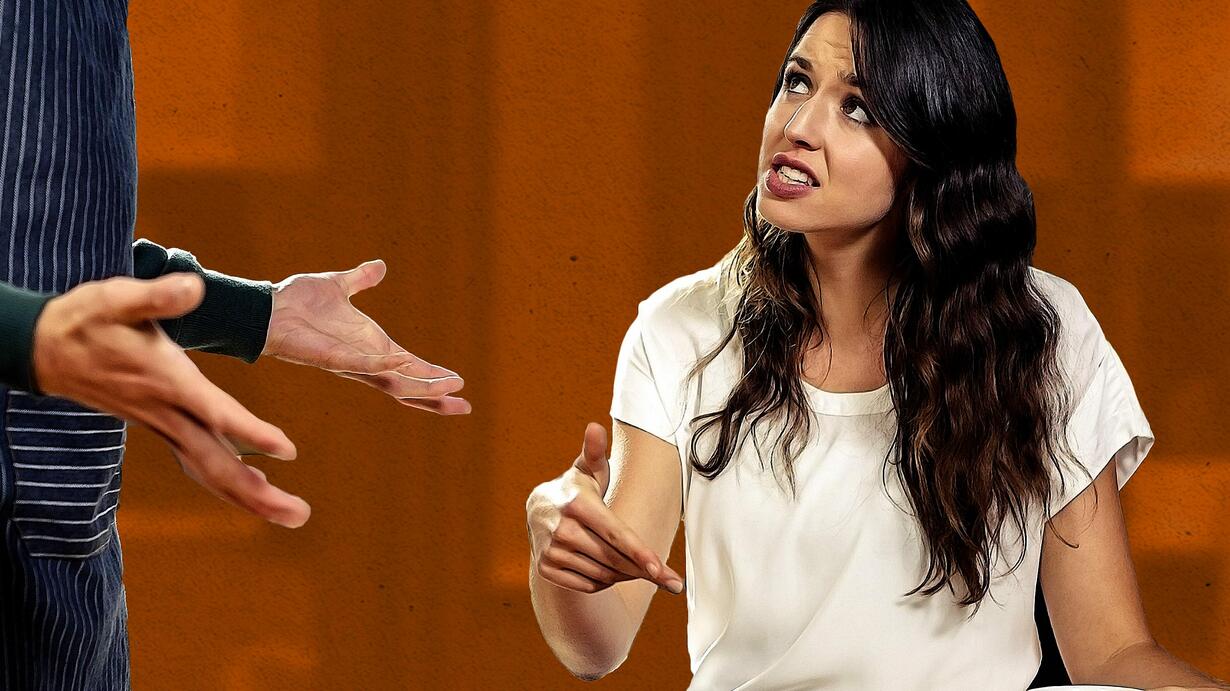 Image: A young woman is arguing with a waiter in a cafe. She has a pastry on her plate and is holding a cup of coffee. Credit: Getty/Wavebreak Media