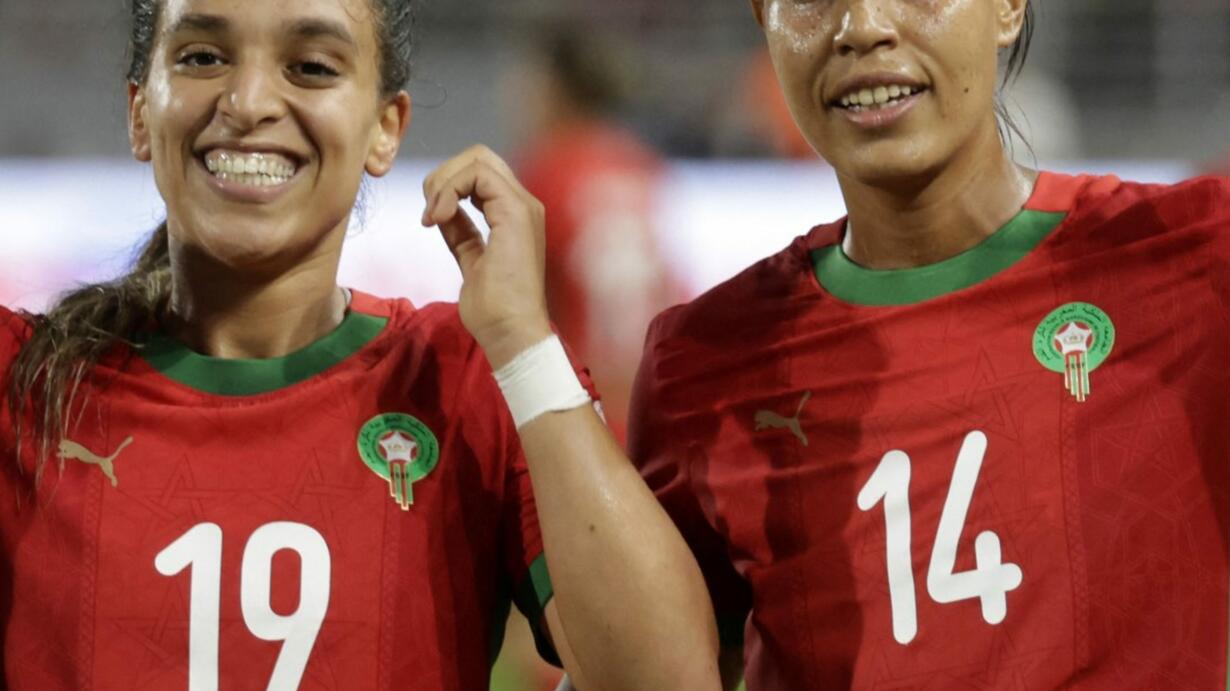 Image: Morocco's forward #19 Sakina Ouzraoui celebrates with defender #14 Aziza Rabbah after scoring her team's equaliser during the 2025 Women's Africa Cup of Nations semi-final football match against Ghana at Prince Moulay Abdellah Stadium in Rabat on July 22, 2025. (Photo by Abdel Majid/AFP via Getty Images)