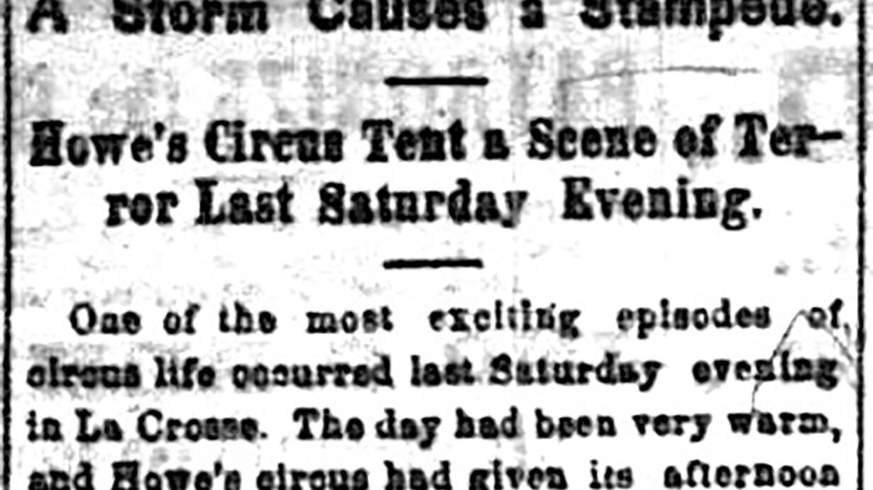 An evening performance of Howe's Great London Circus descended into chaos as a raging summer storm moved through La Crosse in 1875.