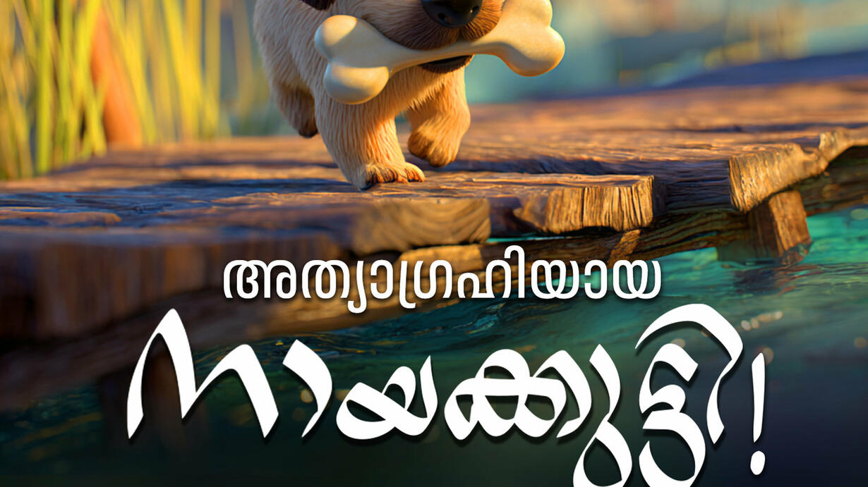 ഒരിടത്ത് ഒരു നായ ഉണ്ടായിരുന്നു. അവൻ മിടുക്കനായിരുന്നെങ്കിലും അവന് ഒരു കുഴപ്പമുണ്ടായിരുന്നു അവൻ മഹാ അത്യഗ്രഹിയായിരുന്നു. ഒരു ദിവസം അവന് വല്ലാതെ വിശന്നു. "വിശന്നിട്ട് വയ്യല്ലോ, എന്തെങ്കിലും കഴിക്കാൻ കിട്ടിയിരുന്നെങ്കിൽ..." നടന്ന് നടന്ന് അവൻ ഒരു കടയുടെ അടുത്തെത്തി. അപ്പോഴാണ് അവൻ അത് കണ്ടത്! താഴെ ഒരു എല്ലിൻ കഷ്ണം കിടക്കുന്നു