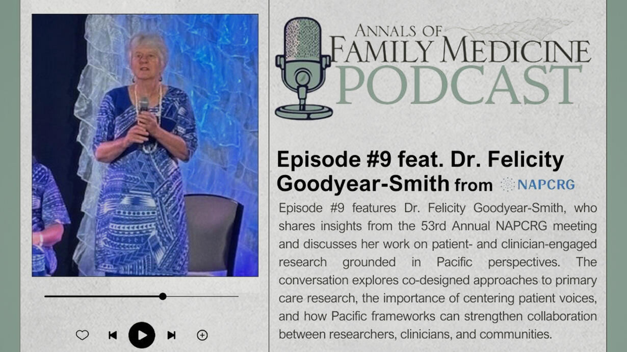 In this first episode of the 2025 Live from the North American Primary Care Research Group (NAPCRG) conference series, we interview Dr. Felicity Goodyear-Smith. She received her undergraduate and medical degrees from the University of Auckland, where she now serves as Professor and Goodfellow Postgraduate Chair of General Practice and Primary Care. A prolific author with more than 360 peer-reviewed publications, 11 books, and 30 book chapters, she joined the Annals of Family Medicine Editorial Advisory Board in 2024 and has delivered several NAPCRG plenaries, including this year’s. Recorded the day before her plenary, the episode previews the talk she and her research collective were about to give, which tells the story of a Pacific co-design research journey that began with a 2016 PaCE workshop and led to the formation of a Pacific community group and a Pacific Practice-Based Research Network in South Auckland, Aotearoa New Zealand. Guided by Pacific research frameworks such as fa’afaletui and the Fonofale model of holistic health, their work involves community groups in every step of the research process and includes projects addressing gout and rheumatic fever.