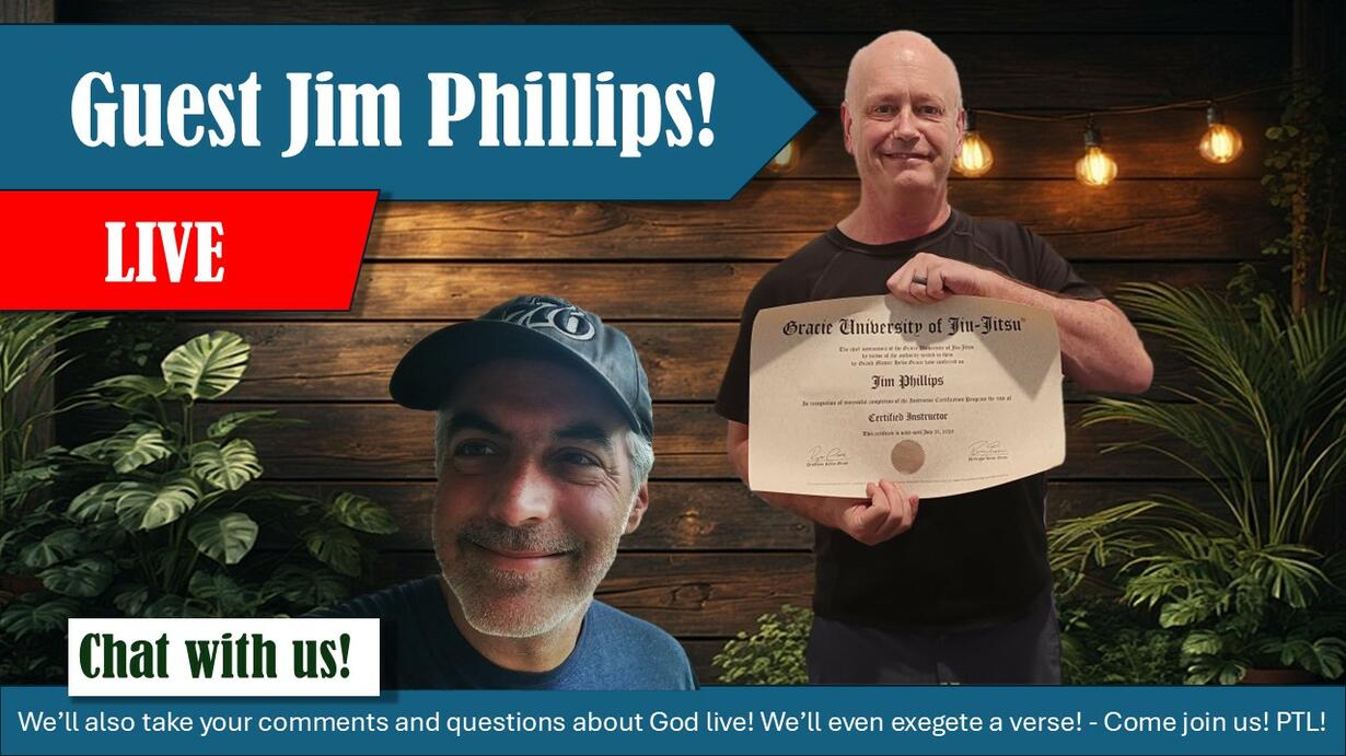 Today, Pastor Joel had Brother Jim Phillips with him, who is a pastor in Houston, Texas, who also knows Jiu Jitsu, travels to Israel to evangelize, been shot at in Israel, writes many books, and leads a Bible College and Seminary. They discussed Jim’s fascinating background with his time in Israel, Passover, Messianic Jews, and more! Then, they took questions and comments from the LiveChat, which covered a wide variety of topics including 1 John 2:28, Exod. 25, and more! The two hours flew by! PTL!
