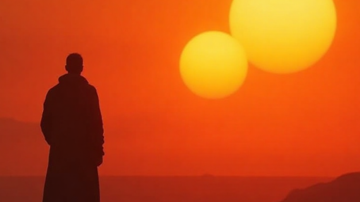 He was looking out at the horizon, viewing his planet's two suns setting.