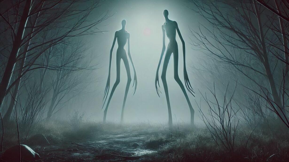 long legged white figures, one tall and one shorter, glide