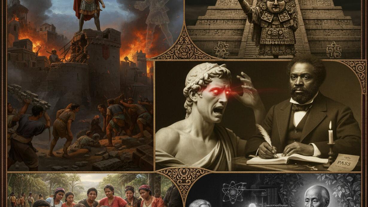 The episode contrasts this state-driven order with the individual and internal struggles for identity. The Aztec empire maintained political and cosmic order through ritualized, spectacular violence and human sacrifice, where access to the most potent religious acts was restricted to the nobility. Conversely, the Greek heroic path, epitomized by Achilles' rage, focused on the individual reclaiming lost honor through deeply personal, passionate violence. In a society structured by oppression, like slavery, figures like Frederick Douglass achieved self-sovereignty not through external help or a grand ritual, but through absolute self-reliance, with his quest for identity beginning with literacy and the dangerous path of writing his own "pass" to freedom.
