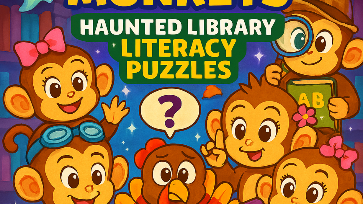 “Mission Monkeys: Haunted Library Literacy Puzzles,” which follows four monkey characters—Mila, Milo, Mia, and Mik—on a silly adventure. Librarian Owlivia calls the Mission Monkeys for help because the books in the Hollow Hills Library are mysteriously flying around and telling jokes, creating “comical chaos.” To restore order, the monkeys must solve a series of literacy puzzles presented by the magical books, including a rhyming riddle, a three-letter spelling challenge, and a counting challenge.
