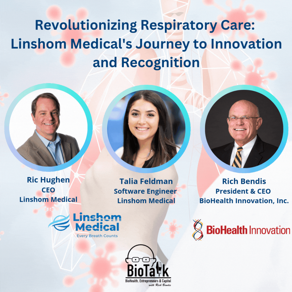 In this episode of BioTalk, host Rich Bendis welcomes Ric Hughen, CEO of Linshom Medical, and Talia Feldman, Software Engineer at Linshom Medical, to discuss their groundbreaking advancements in respiratory monitoring technology. As the main winners of the 2024 Crab Trap Competition at the 10th Annual BioHealth Capital Region Week, Ric and Talia share Linshom’s mission to improve patient safety through their innovative and accessible respiratory monitoring devices.