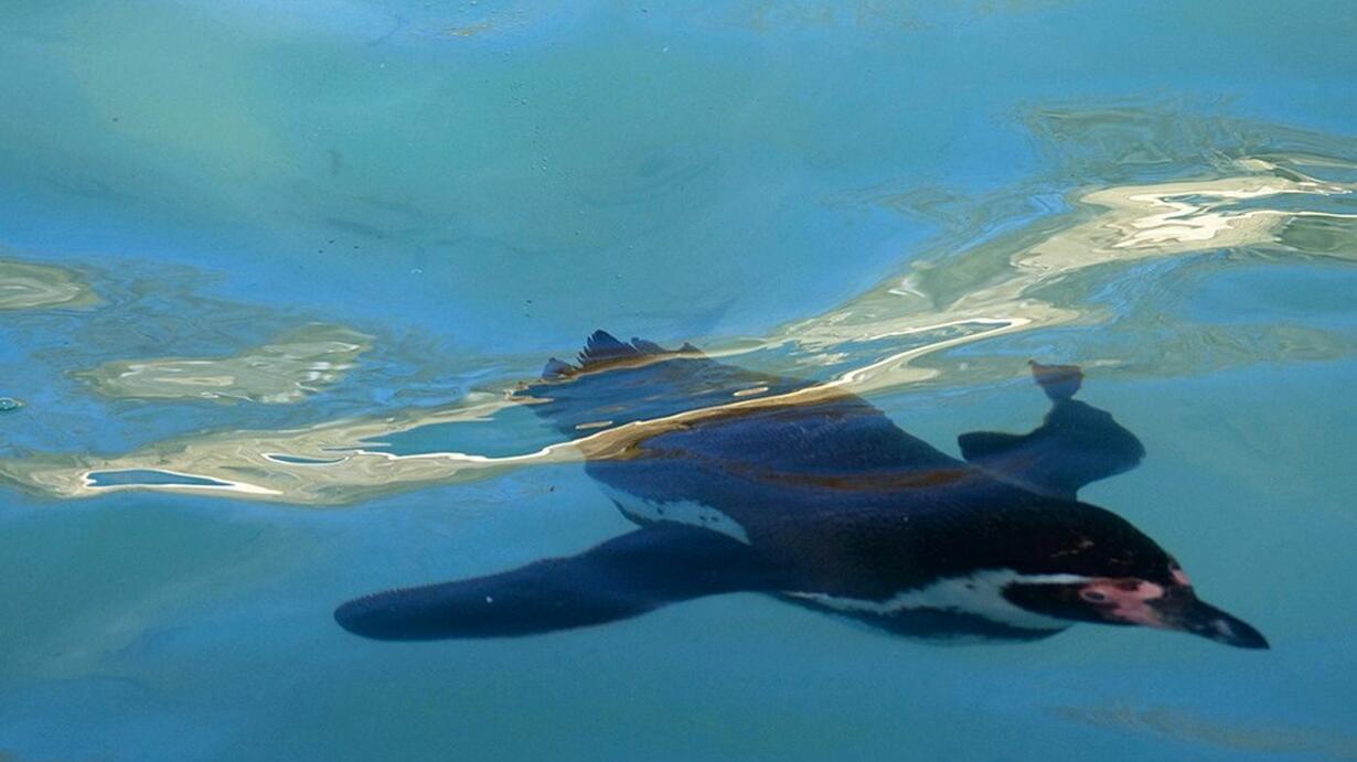 The ability to fly seems to define birds. But there are more than 50 species of flightless birds throughout the world — from the Ostrich and Kiwi to flightless rails, ducks, and this Humboldt Penguin. Why did they evolve the inability to fly? Many dwelt on islands. Others evolved until they were huge, like the extinct 12-foot-tall Moas of New Zealand. And the penguins? Unlike most flightless birds, they still have the strong flight muscles and keeled breastbones of flying birds. They are supremely graceful flyers — but they do it under water!