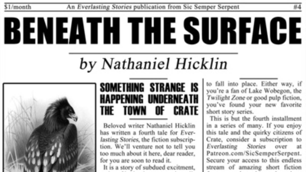 Available now and forever right here on the Everlasting Stories Podcast, continue your mysterious journey through the "News from Crate" with episode "#4 - Beneath the Surface" AUTHOR: Nathaniel Hicklin. MUSIC: "This Feeling" by LAKEY INSPIRED. MASTERING: Michael Strand. NARRATOR: Michael Strand. PUBLISHER: Thomas "Eco-Copywriter" Crouse of Sic Semper Serpent Books.