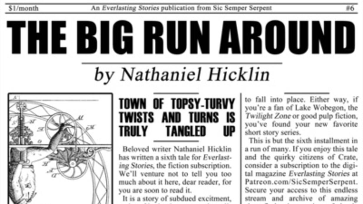 Available now and forever right here on the Everlasting Stories Podcast, peer through the cracks in the "News from Crate" with episode "#6 - The Big Run Around" AUTHOR: Nathaniel Hicklin. MUSIC: "Warm Nights" by LAKEY INSPIRED. MASTERING: Michael Strand. NARRATOR: Michael Strand. PUBLISHER: Thomas "Eco-Copywriter" Crouse of Sic Semper Serpent Books.