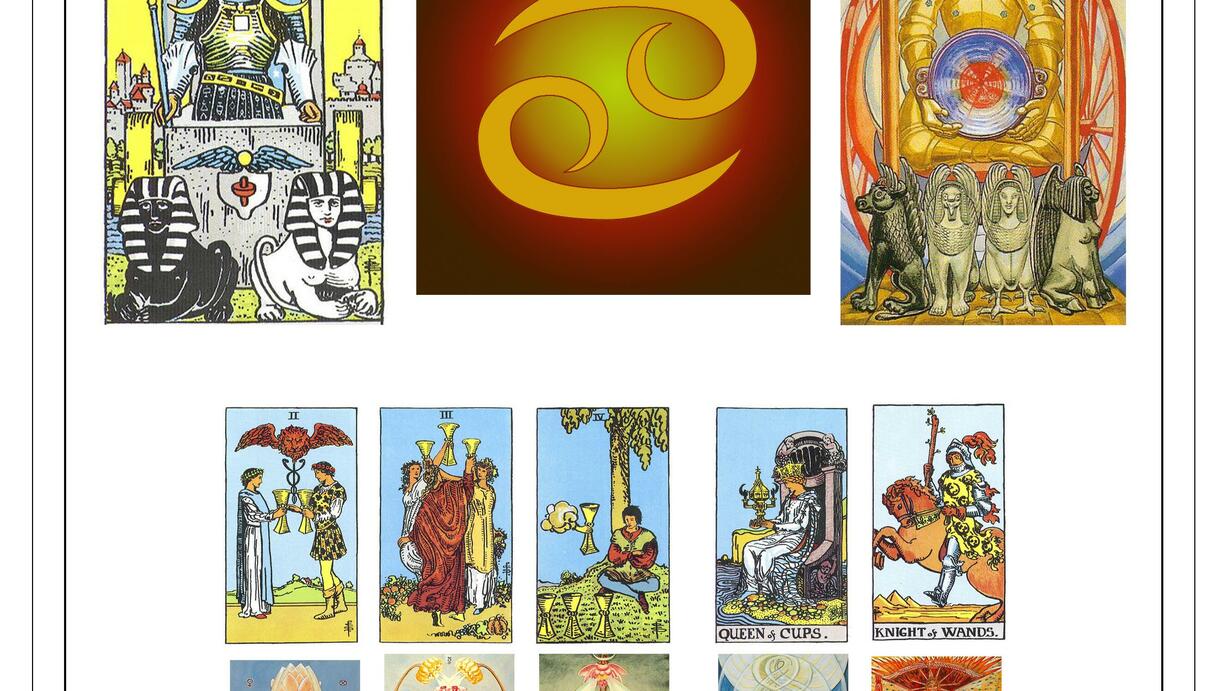 -The Chariot (zodiacal major of Cancer ). -The 2, 3, and 4 of Cups (minors of Cancer) -The Queen of Cups and the Knight/Prince of Wands (court cards of Cancer)