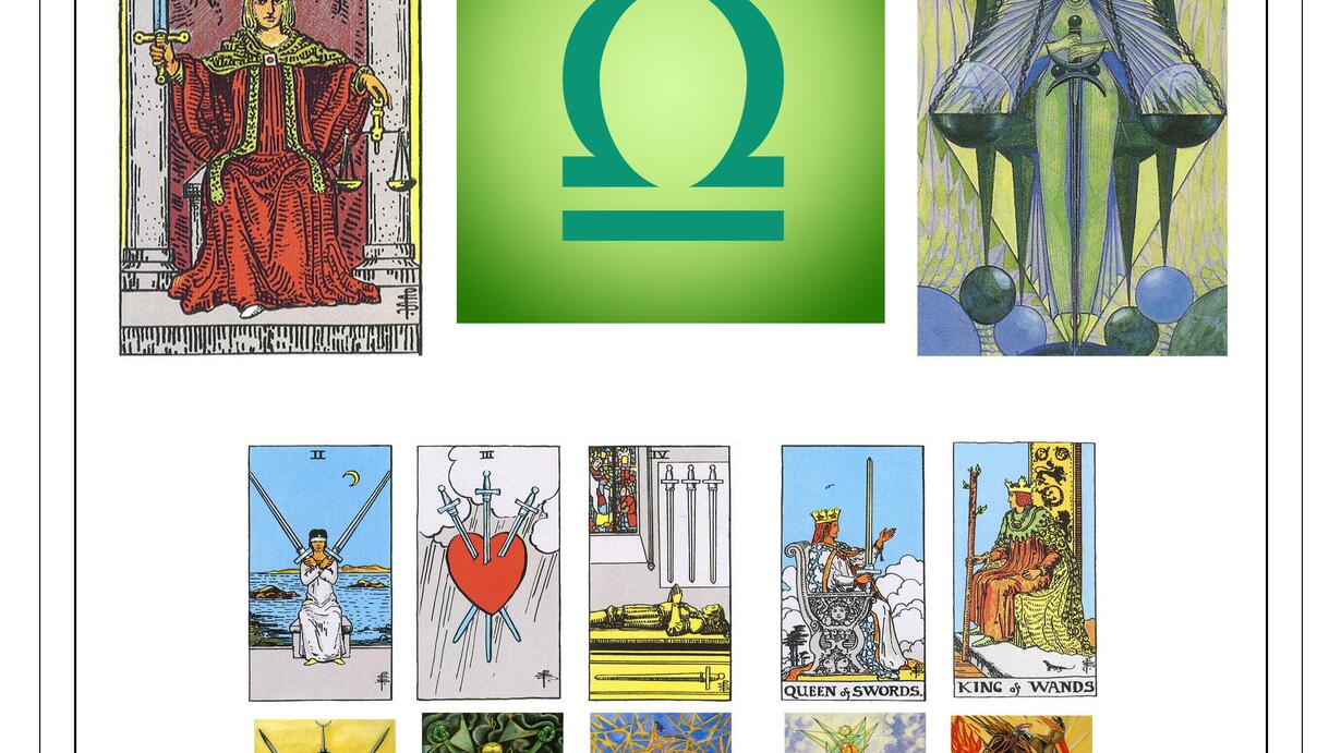 - Justice/Adjustment (zodiacal major of Libra). - The 2, 3, and 4 of Wands (minors of Libra) - Queen of Swords and Knight/Prince of Cups (court cards of Libra)