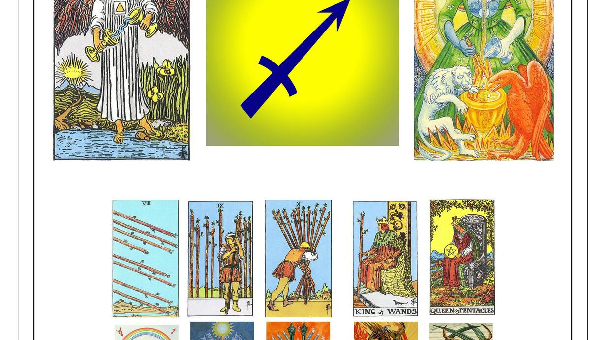 - Temperance/Art (zodiacal major of Sagittarius). - The 8, 9, and 10 of Wands (minors of Sagittarius) - King/Knight of Wands and Queen of Pentacles/Disks (court cards of Sagittarius)