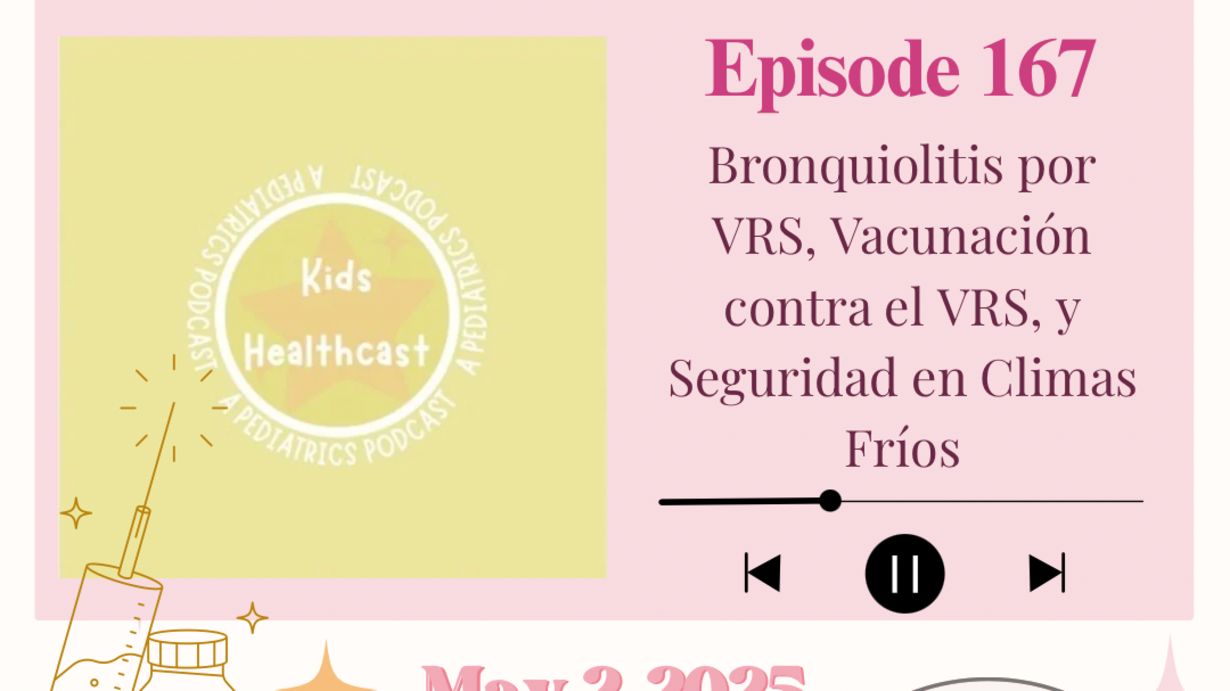 En el nuevo episodio de hoy, es una traducción al español de un episodio original sobre el virus VRS, escrito y grabado por los Doctores Hare, Jeffers, y Samuel. Hoy, escucharán a la Doctora Abigail Kerschner y la Doctora Ginny Lee Olivier sobre varios temas que ustedes, como padres, pueden estar preguntándose. Este mes, comenzaremos con el tema principal, la bronquiolitis por VRS, luego, el tema de noticias de salud, y la vacunación contra el VRS. Y como siempre, terminaremos con una trivia divertida e interesante: el consejo para padres este mes es sobre la seguridad en climas fríos.    Tema Tiempos:  Bronquiolitis por VRS: 4:38 Vacunacion contra el VRS: 13:50 Seguridad en Climas Frios: 15:52 Trivia: 19:29