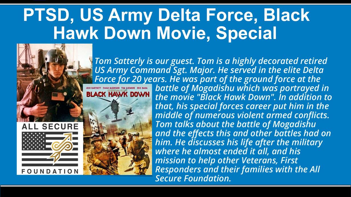 PTSD, US Army Delta Force, Black Hawk Down Movie, Special Episode. For retired U.S. Army Command Sgt. Major Tom Satterly, the battlefield was never truly left behind. With 25 years of service, 20 of them in the elite "Delta Force". Satterly became a living legend in the world of Special Operations. He was on the ground during the infamous "Battle of Mogadishu", the same firefight portrayed in the movie "Black Hawk Down". But it wasn’t the bullets or the RPGs that almost ended him, it was the silence that followed. In the Law Enforcement Talk Radio Show and Podcast promoted across their Facebook , Instagram , LinkedIn , Medium and other social media platforms.