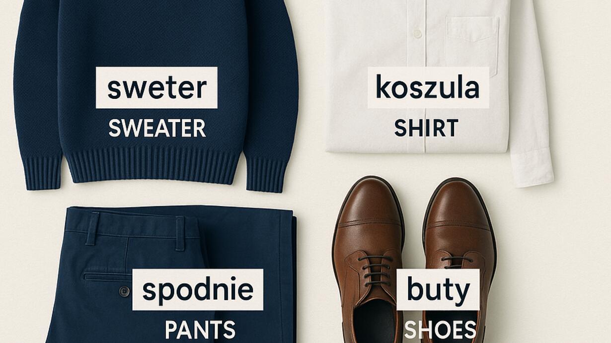 Episode 19: Roy (student) and Kamila (teacher) cover Polish clothing vocabulary (ubrania) — koszula, spodnie, bluzka, sukienka, buty and more — and practice phrases like "Mam na sobie" to say what you are wearing.