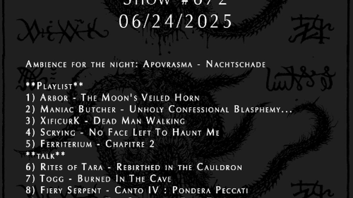 672 - Recorded live on June 24, 2025 Ambience for the night: Apovrasma - Nachtschade https://apovrasma.bandcamp.com/album/nachtschade **Playlist** 1) Arbor - The Moon's Veiled Horn 2) Maniac Butcher - Unholy Confessional Blasphemy... 3) XificurK - Dead Man Walking 4) Scrying - No Face Left To Haunt Me 5) Ferriterium - Chapitre 2 **talk** 6) Rites of Tara - Rebirthed in the Cauldron 7) Togg - Burned In The Cave 8) Fiery Serpent - Canto IV : Pondera Peccati 9) Αχέροντας - The Chalice of Fiery Transmutation **talk** 10) Ara - Bei meinem Blut Live every Tuesday at 9pm ET on NSTMRadio.com