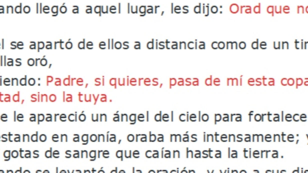Luc 22:39 Y saliendo, se fue, como solía, al monte de los Olivos; y sus discípulos también le siguieron. Luc 22:40 Cuando llegó a aquel lugar, les dijo: Orad que no entréis en tentación. Luc 22:41 Y él se apartó de ellos a distancia como de un tiro de piedra; y puesto de rodillas oró, Luc 22:42 diciendo: Padre, si quieres, pasa de mí esta copa; pero no se haga mi voluntad, sino la tuya. Luc 22:43 Y se le apareció un ángel del cielo para fortalecerle. Luc 22:44 Y estando en agonía, oraba más intensamente; y era su sudor como grandes gotas de sangre que caían hasta la tierra. Luc 22:45 Cuando se levantó de la oración, y vino a sus discípulos, los halló durmiendo a causa de la tristeza; Luc 22:46 y les dijo: ¿Por qué dormís? Levantaos, y orad para que no entréis en tentación.