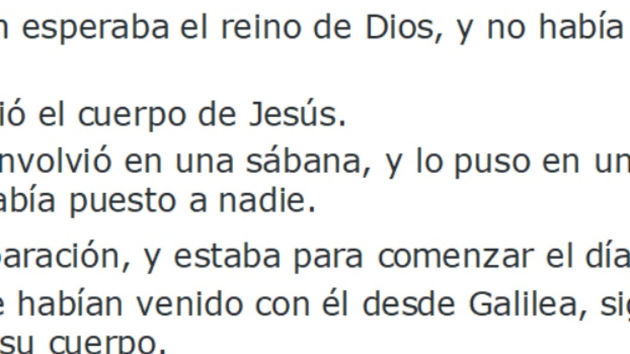 Jesús es sepultado Luc 23:50 Había un varón llamado José, de Arimatea, ciudad de Judea, el cual era miembro del concilio, varón bueno y justo. Luc 23:51 Este, que también esperaba el reino de Dios, y no había consentido en el acuerdo ni en los hechos de ellos, Luc 23:52 fue a Pilato, y pidió el cuerpo de Jesús. Luc 23:53 Y quitándolo, lo envolvió en una sábana, y lo puso en un sepulcro abierto en una peña, en el cual aún no se había puesto a nadie. Luc 23:54 Era día de la preparación, y estaba para comenzar el día de reposo.[a] Luc 23:55 Y las mujeres que habían venido con él desde Galilea, siguieron también, y vieron el sepulcro, y cómo fue puesto su cuerpo. Luc 23:56 Y vueltas, prepararon especias aromáticas y ungüentos; y descansaron el día de reposo,[b] conforme al mandamiento.