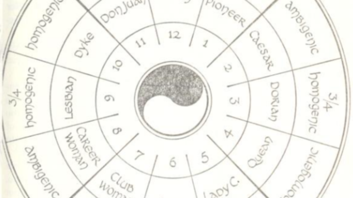 [Image: The Circle of Sex, a diagram of a circle cut into twelve segments, with a Yin-Yang symbol at the centre. Each segment has a label such as 'Hyperheterogenic - Don Juan' or '3/4 homogenic - Lesbian'.]