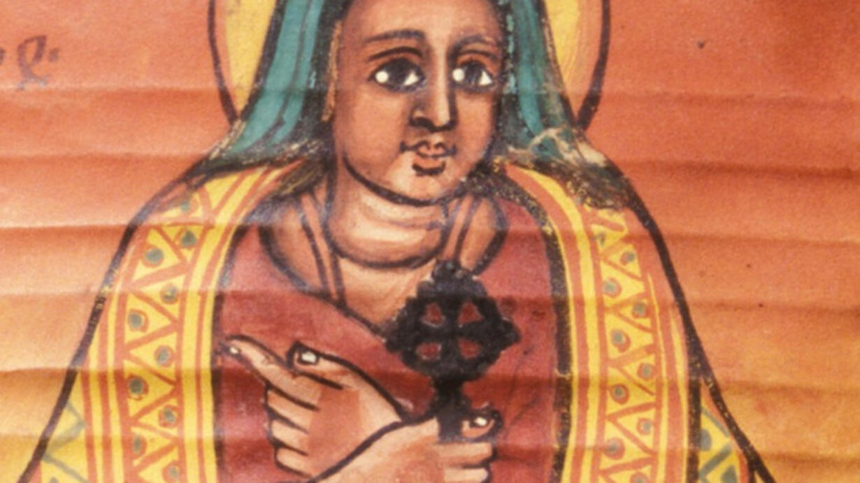 [Image: Illustration of Walatta Petros, an Ethiopian nun wearing an orange patterned shawl. She is holding a cross, and has a halo above her head. Source.]