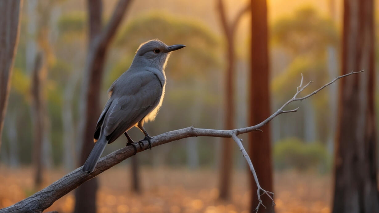 A small stream cuts its way through a secluded Australian forest. The water babbles gently and a light wind rustles the trees above. The sun begins to set, casting a brilliant orange glow amongst the trees, and a cuckoo bird shouts its calls from the distance.