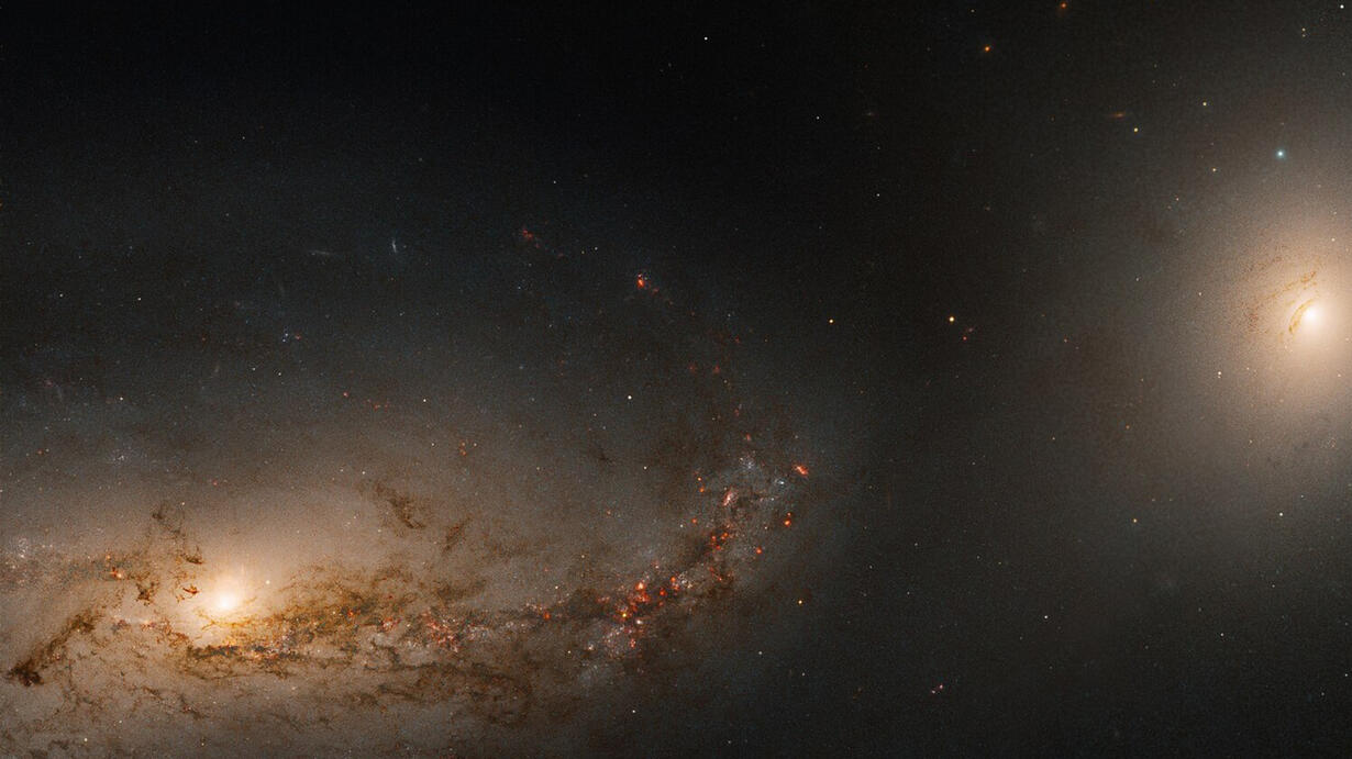 (This image shows galaxy NGC 3227, at left, with its neighbor NGC 3226, as viewed in optical light by the Hubble Space Telescope. Despite copious features common to spiral galaxies, including rich dust lanes, a bright central bulge, and new stars forming along its spiral arms, this galaxy is actually active, with bright features emanating from the central supermassive black hole in non-optical wavelengths of light. Credit: NASA, ESA, and H. Ford (Johns Hopkins University); Image Processing: G. Kober (NASA Goddard/Catholic University of America))