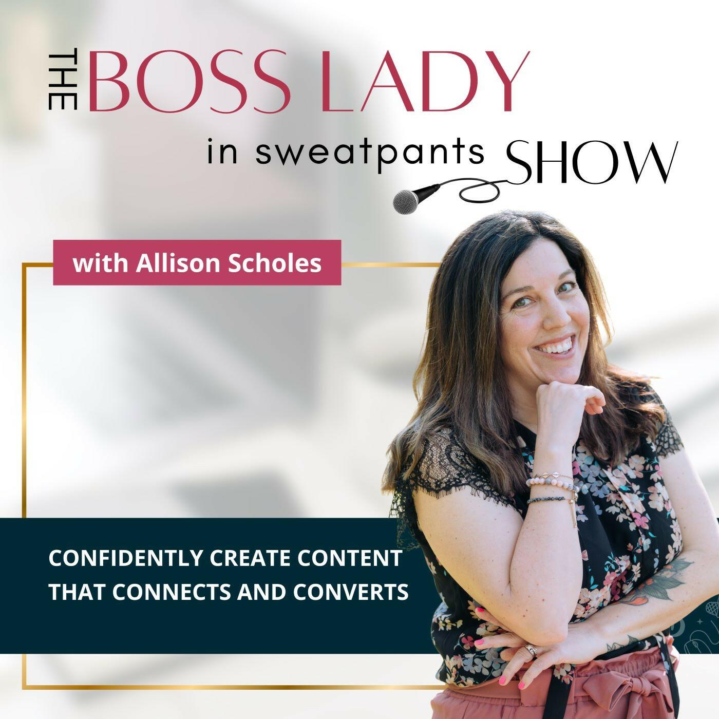 Hey. I’m Allison Scholes. My mission is to help female entrepreneurs create content in an authentic, easy, simple and fun way. I believe the content creation process should be exciting and easy, not time consuming! I am here to help you streamline your content creation plan, define and fine tune your personal brand, elevate your marketing skills, write better copy, implement an easy social media strategy and more. It’s finally time to create less, but BETTER content that makes a BIGGER impact. In this Podcast, you will find creative copy and content tips, hacks for social media and sales, business growth secrets, and expert guests who will help you blow up your business and bank account. Find exciting content creation episodes, branding strategies, social media hacks and more. It’s time to streamline your content plan and show up as your most authentic you! Connect with me: www.bossladyinsweatpants.com
