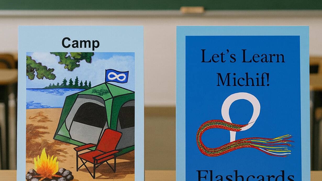 Michif, which blends French nouns with Cree verbs and structure, has just a handful of fluent speakers left. Among them is Elder Norman Fleury, who lends his voice to the Andersons’ flashcard sets and learning materials.