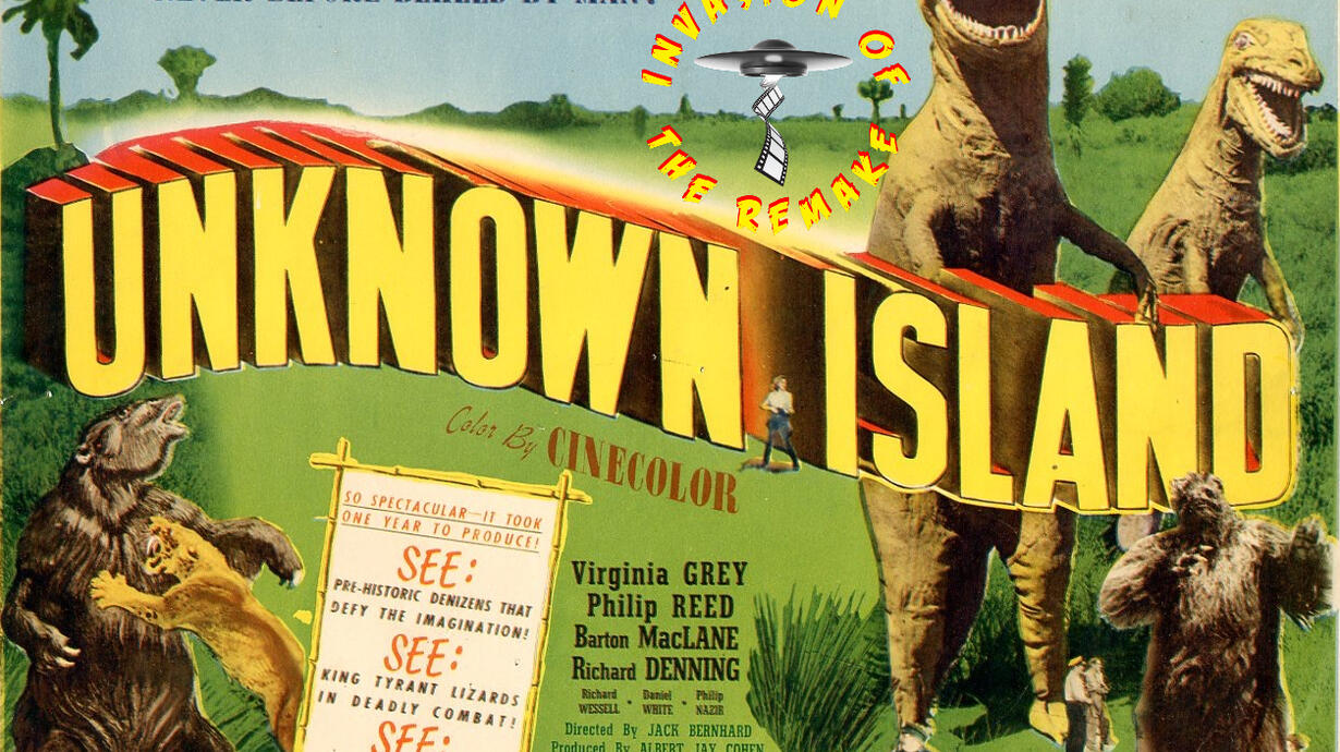 We're off to the Unknown Island (1948). How can we possibly find it? We've got a map silly. This obscure Movie Classics film may have fallen into the public domain but it found its way into our imagination thanks to this week's fan challenge remake. It is an adventure on an island full of dinosaurs preserved out of time and we were sold on it when we heard about the giant sloth & t-rex fight. Join Invasion of the Remake on an adventure to Unknown Island!