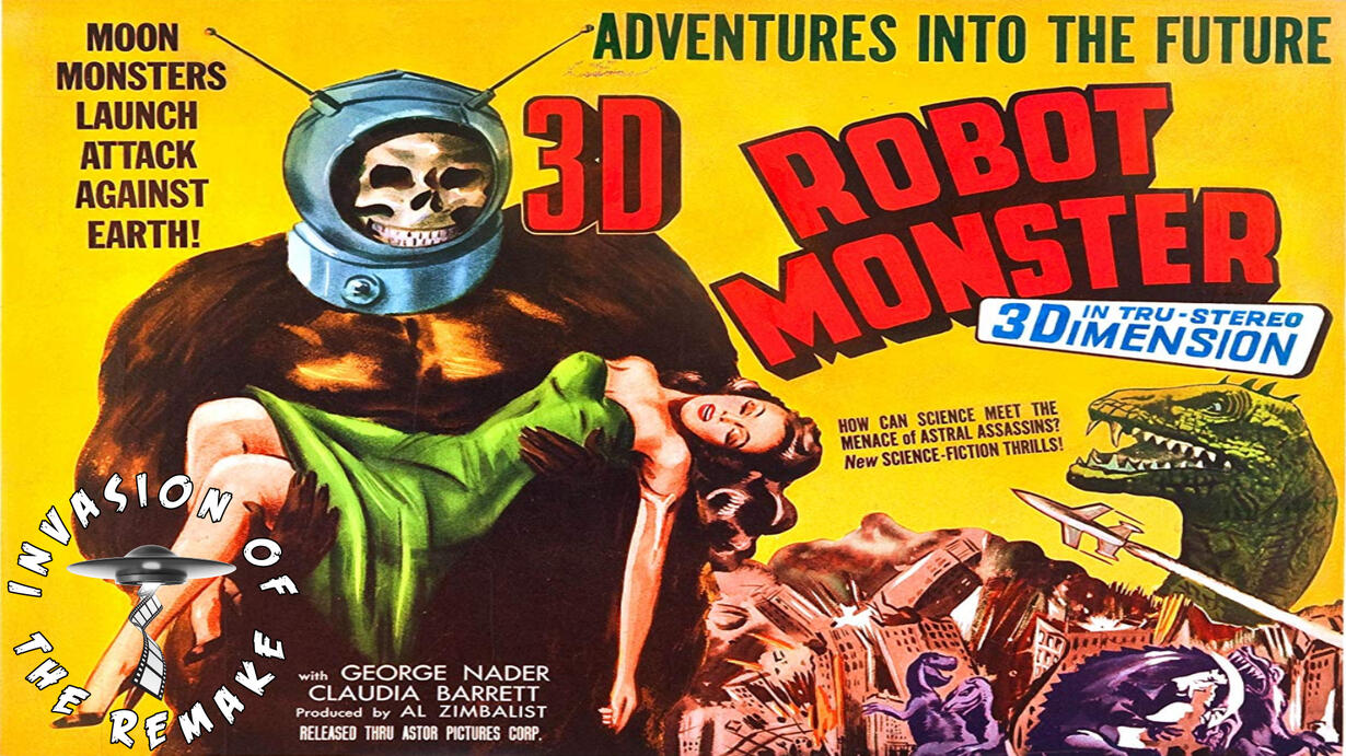 Week 3 of Alien Invasion April brings the fearsome Ro-Man, an ape with a space helmet for a head, to conquer Earth in Robot Monster (1953). Widely criticized for being one of the worst movies ever made, Invasion of the Remake sees something worthy in the simian from space that can raise this cult, sci-fi, stinker to new heights. Join IOTR this week as we remake Robot Monster!!!