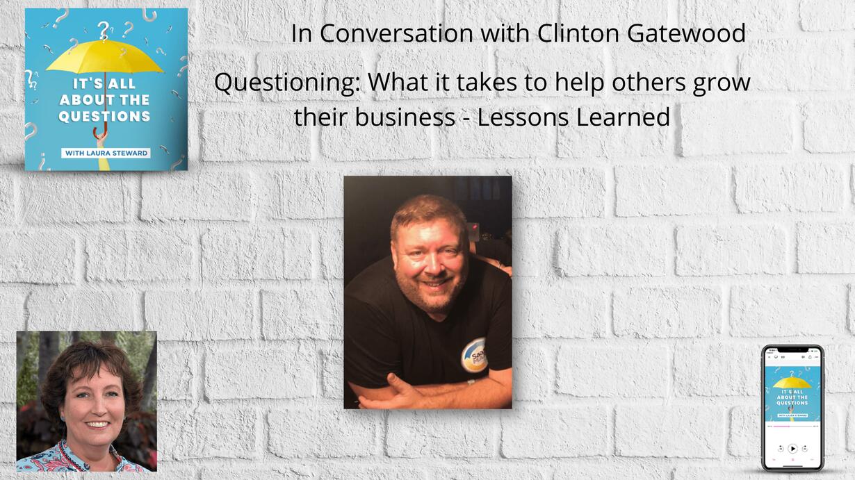 Clint shares a lot more from his many decades working for someone, working for himself and helping clients grow. Take a listen and then share on your social tagging #ItsAllAboutTheQuestions or @TheLauraSteward what your takeaway is.