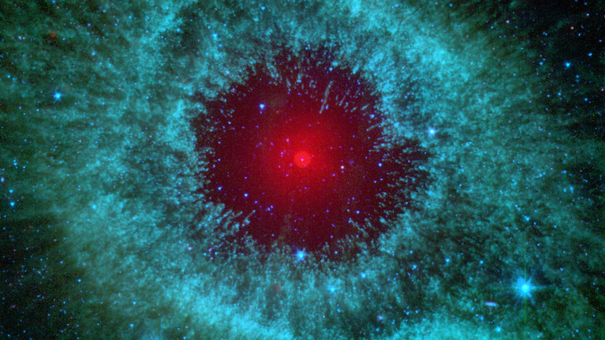 Image: Comets Kick up Dust in Helix Nebula, NASA and JPL-Caltech, Univ. of Ariz., PD, Wikimedia Commons, cropped.