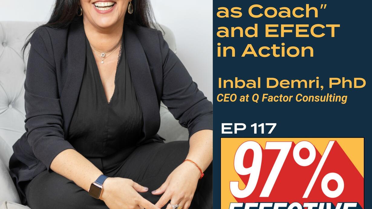 It’s one thing to talk about something, it’s another to see it in action. In this episode of 97% Effective, Dr. Inbal Demri coaches host Michael Wenderoth – showing the EFECT framework that underpins her new Stanford course “Coaching Skills for Effective Leadership.” During the live coaching conversation, Inbal points out critical elements in EFECT and demonstrates coaching skills that every leader can utilize to increase their effectiveness. By the end of this episode, you’ll have seen powerful examples of coaching conversations that you can also use at work. (Make sure to check out our previous episode, EP 116, which covers why she designed the Stanford course, and how it will help you go from transactional to transformative in the way you lead others, and your organization).