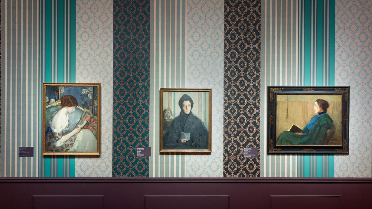Image: Installation view: Dangerously Modern: Australian Women Artists in Europe 1890-1940, featuring A letter from the front (Girl on couch), The letter, Woman reading by Agnes Goodsir, Art Gallery of South Australia, Adelaide; photo: Saul Steed