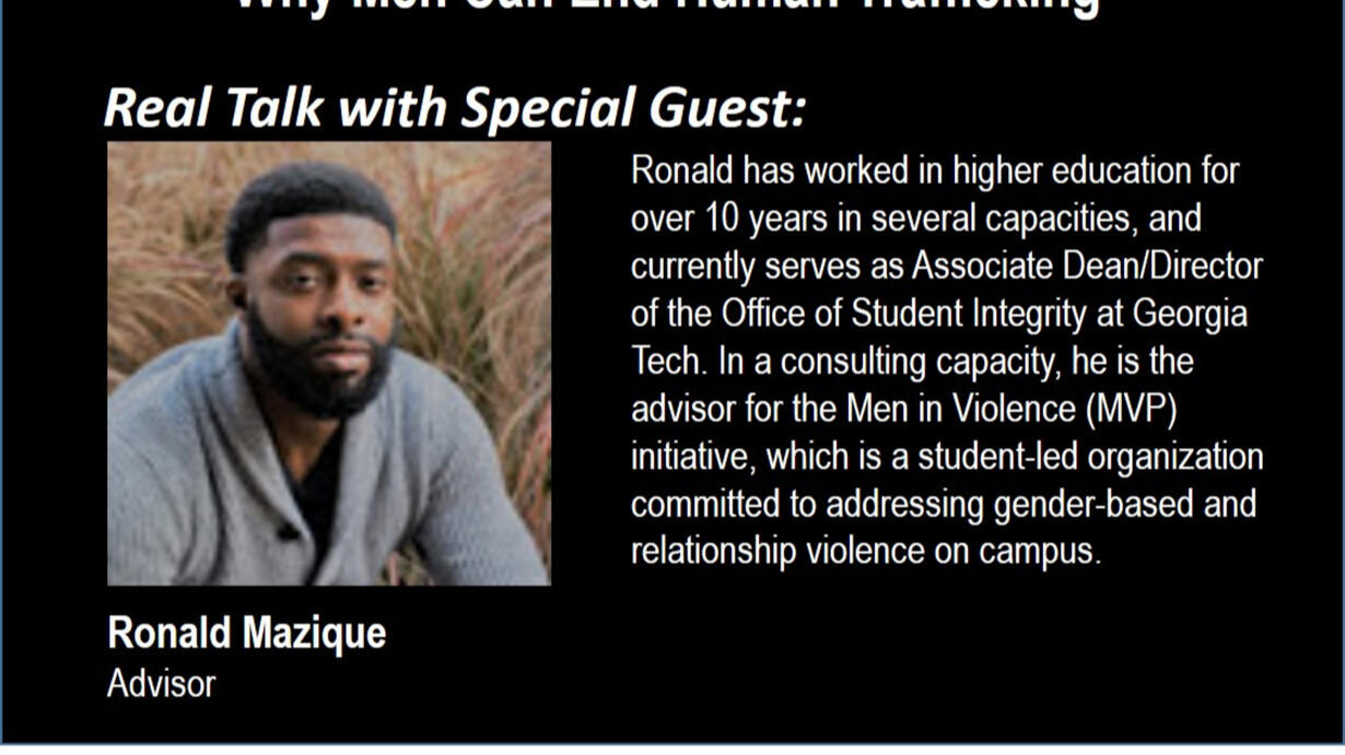 This is part 2 of a 3 part series on human trafficking. In this episode we talk with Ronald Mazique an advisor of the Men in Violence Prevention (MVP) Initiative, a program of the International Human Trafficking Institute. Ronald Mazique has worked in higher education for over 10 years in several capacities, including student conduct, student legal services and multicultural affairs. He currently serves as Associate Dean/Director of the Office of Student Integrity at Georgia Tech. In partnership with his wife (Jaray Mazique), he is the co-founder of Clearpath Creations, LLC, which provides education-based consulting services for K-12, colleges and universities, as well as community organizations. For more information you can email Ronald at clearpathcreations@gmail.com.