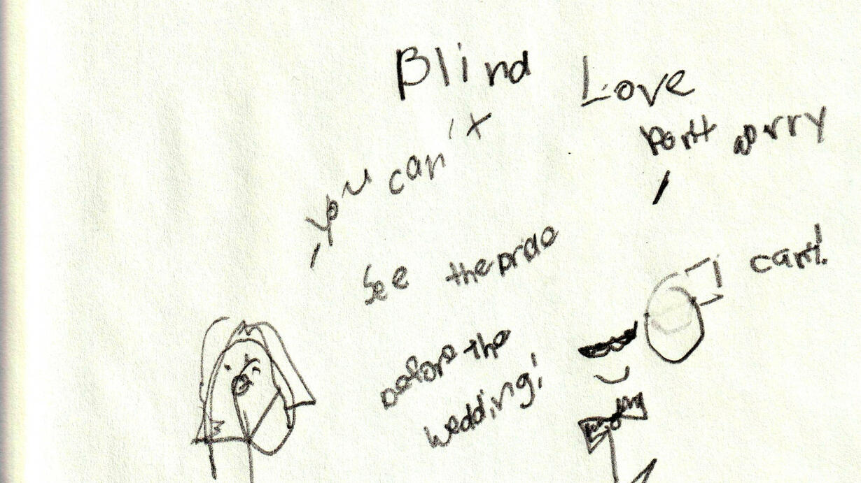 (Episode Art: An image depicts a stick figure of Jan in her wedding gown on the left as she says, "you can't see the bride before the wedding!" On the right, a stick figure of Marc wearing a bowtie replies, "don't worry, I can't!" The words "Advantages Of Blind Love" are written in big letters above the scene. The sketch was drawn by Marc Rocheleau, who is completely blind.)