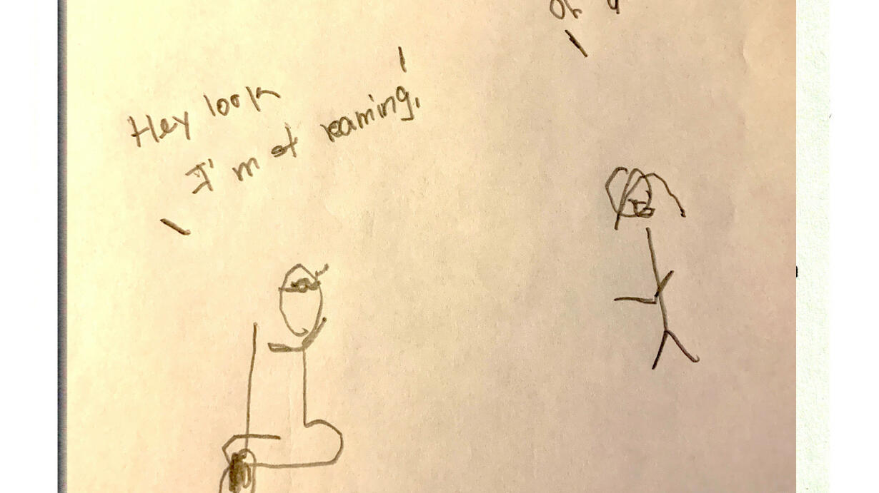 [Episode art: An image depicts a stick figure of Marc in an inflatable raft on the water, holding a paddle and saying, "Hey look, I'm streaming!" On the right side of the image, a stick figure of Jan stands on land and replies, "Oh God..." The words "Bad Connection" are written in big letters above the scene. The sketch was drawn by Marc Rocheleau, who is completely blind.)